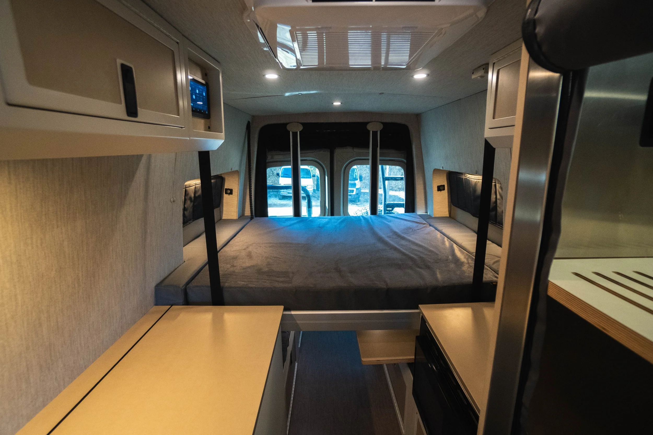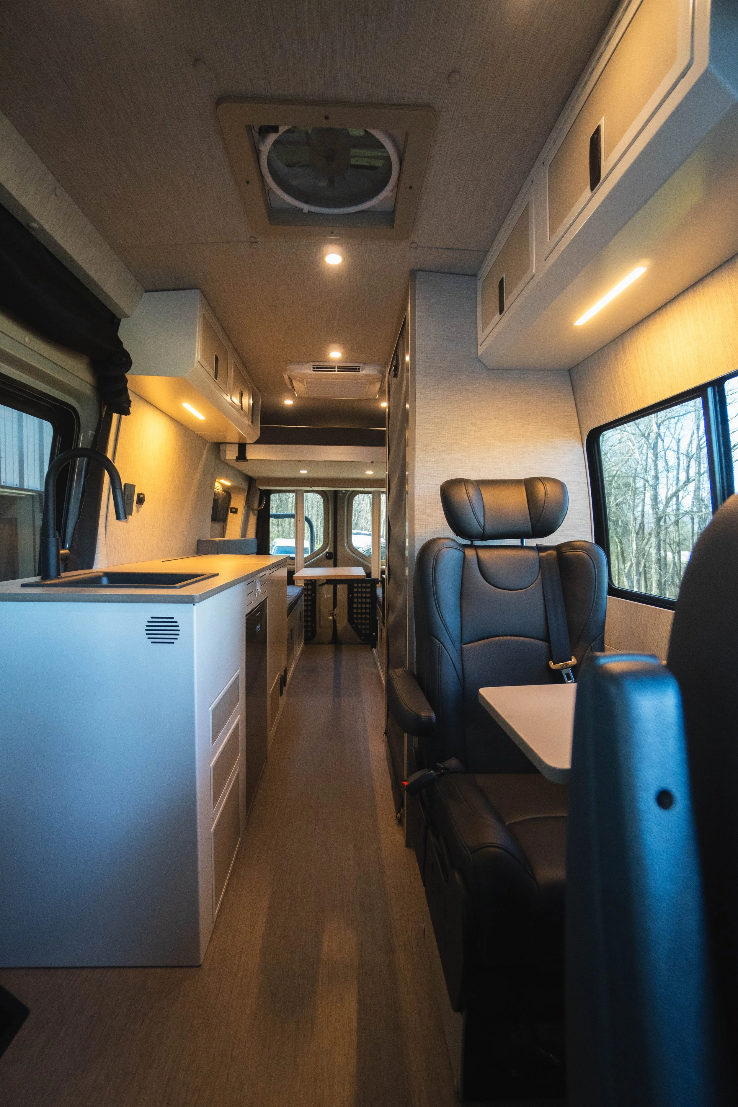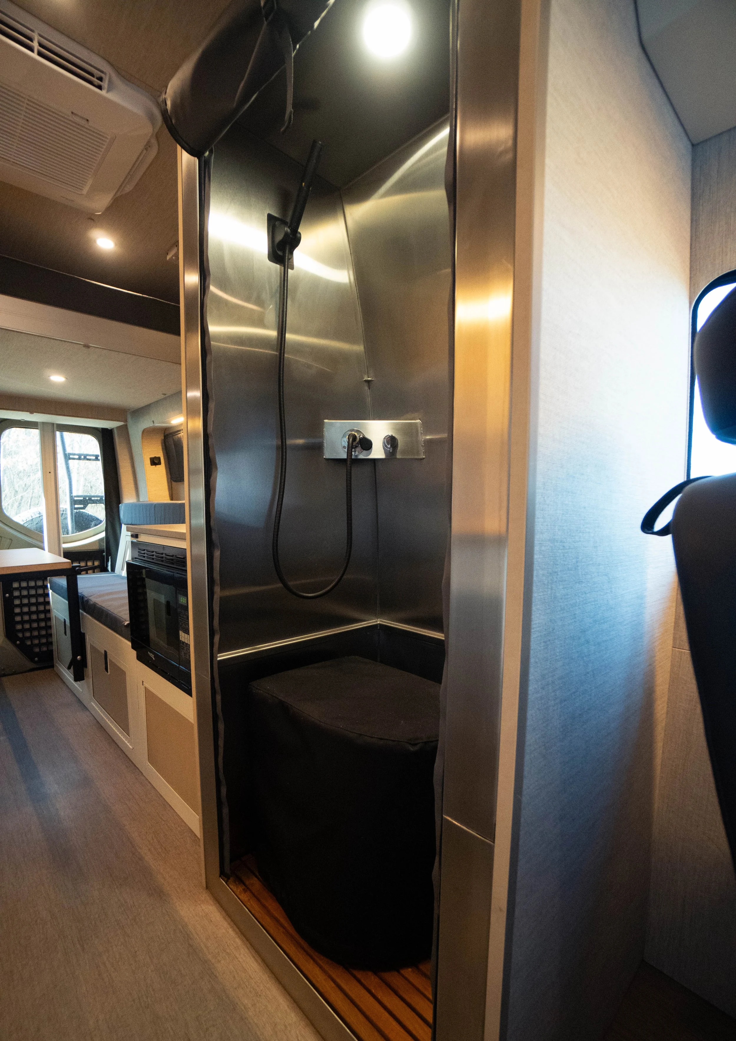 we think the el beasto has it all! We designed this layout with extended stays in mind. wether your parked at the base of a mountain for a ski season or traveling the country for work this van has you covered. it features our aluminum cabinetry throughout. This beast comes with an extended galley cabinet with 2 refrigerators, sink / faucet, induction cooktop, comes equipped with a full size aluminum shower, a lift bed / dinette in the rear, and a 3rd seat that converts to a bed. off grid capable ac keeps you cool in the summer and a hydronic system keeps the heat pumping in the winter.