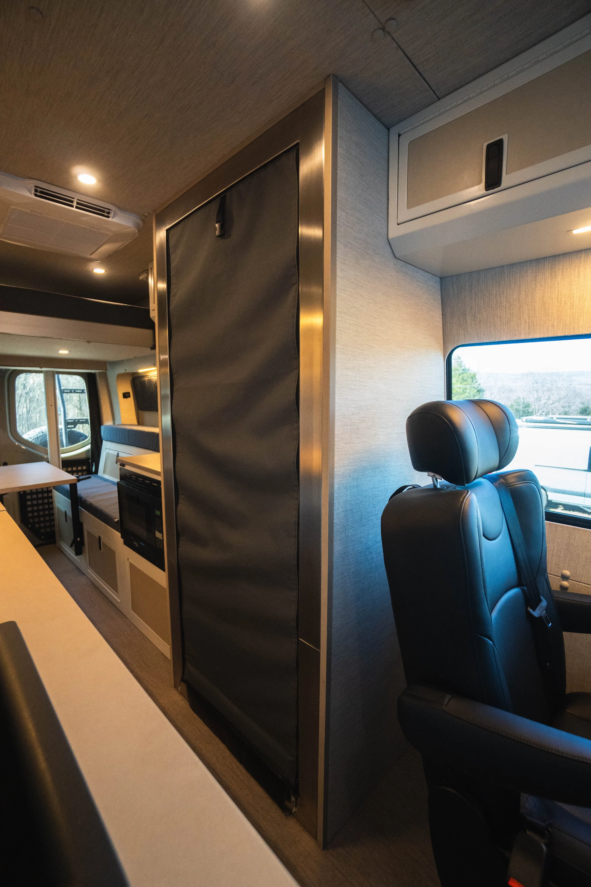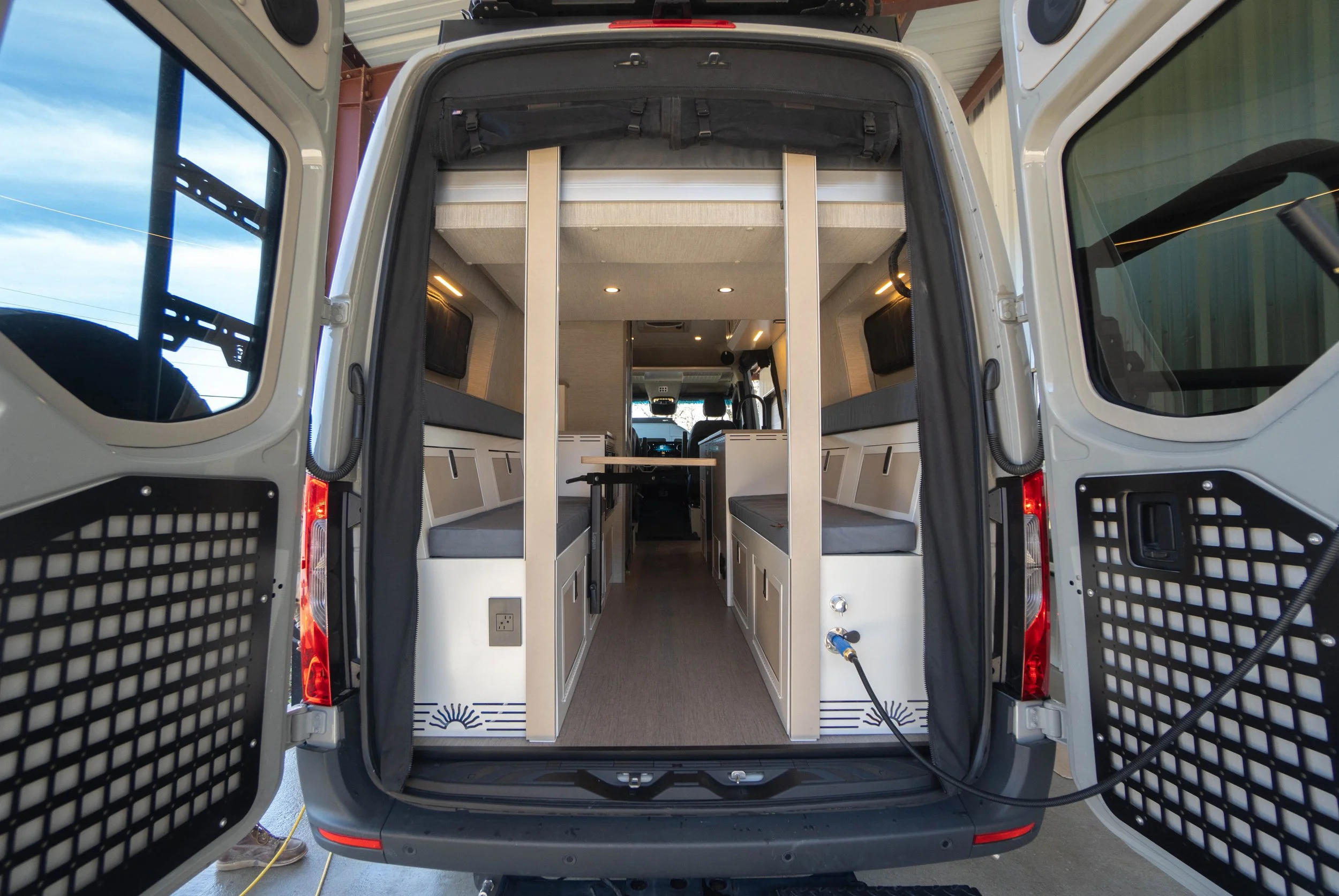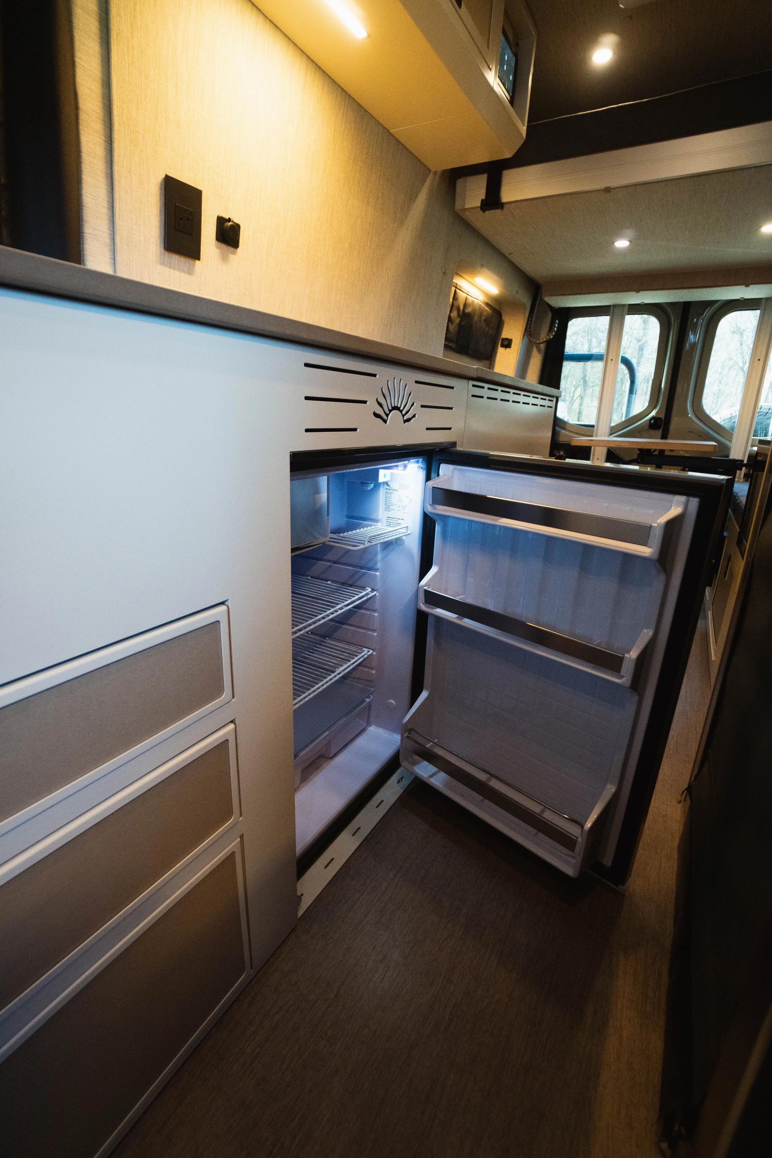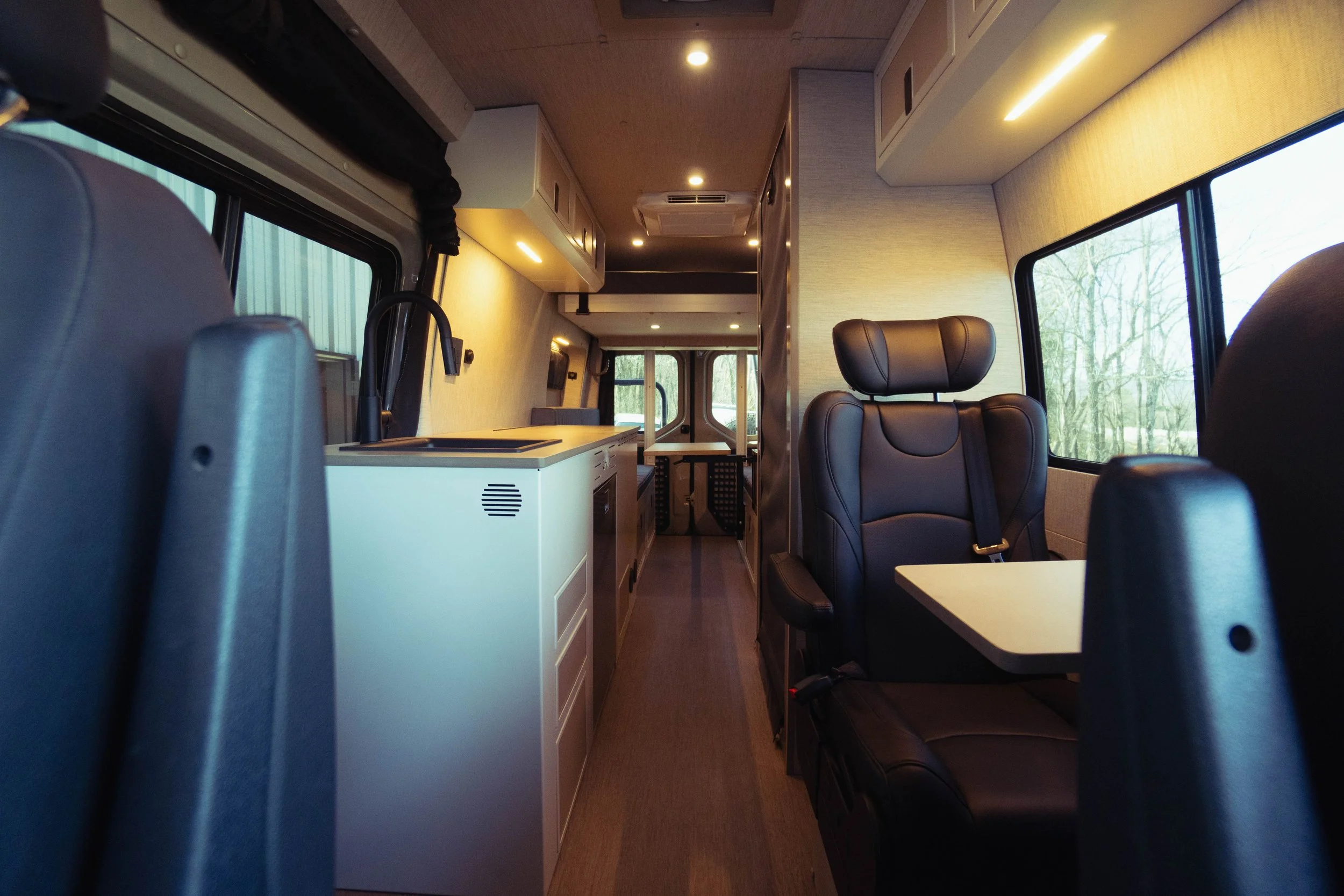 we think the el beasto has it all! We designed this layout with extended stays in mind. wether your parked at the base of a mountain for a ski season or traveling the country for work this van has you covered. it features our aluminum cabinetry throughout. This beast comes with an extended galley cabinet with 2 refrigerators, sink / faucet, induction cooktop, comes equipped with a full size aluminum shower, a lift bed / dinette in the rear, and a 3rd seat that converts to a bed. off grid capable ac keeps you cool in the summer and a hydronic system keeps the heat pumping in the winter.