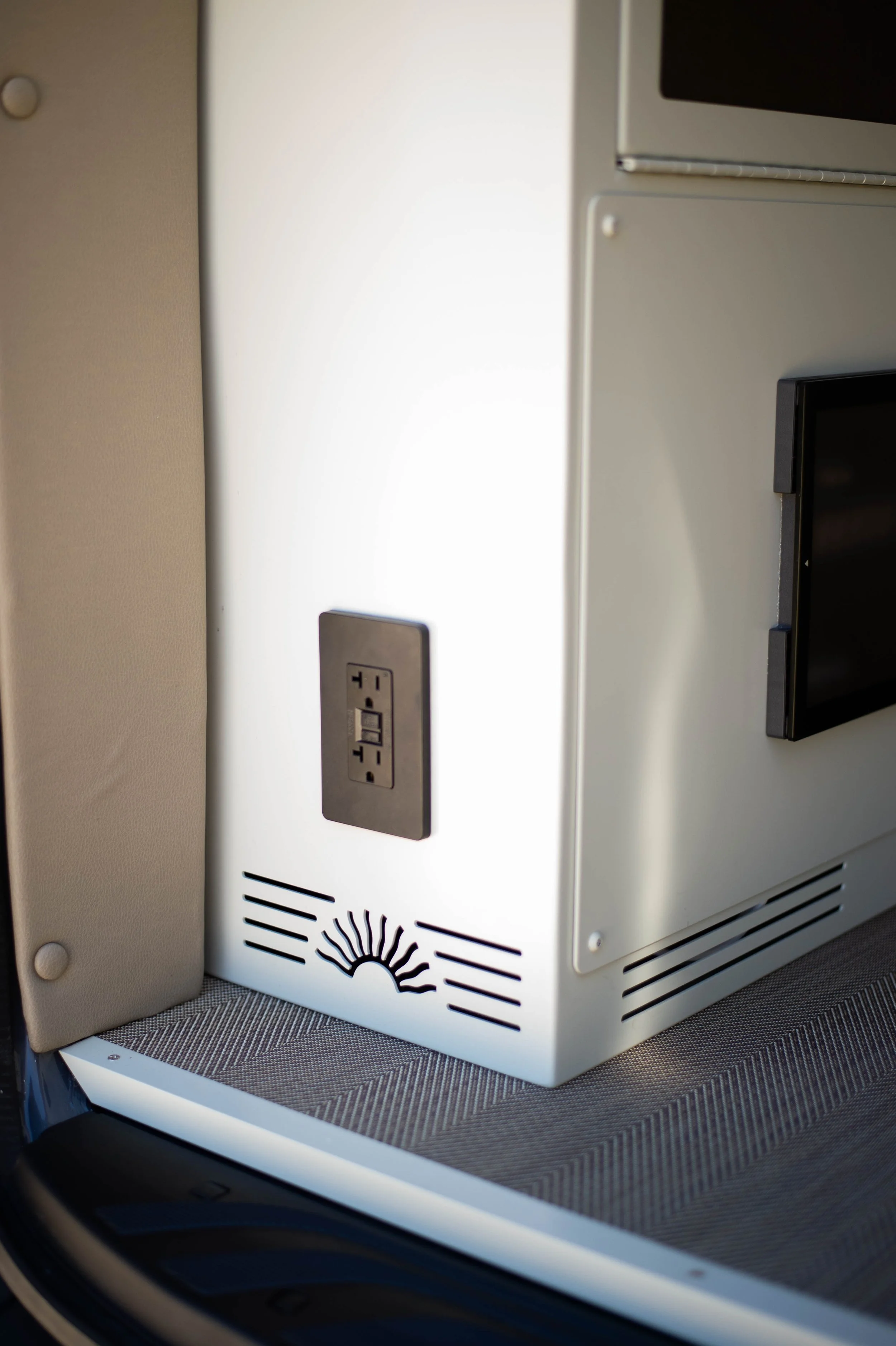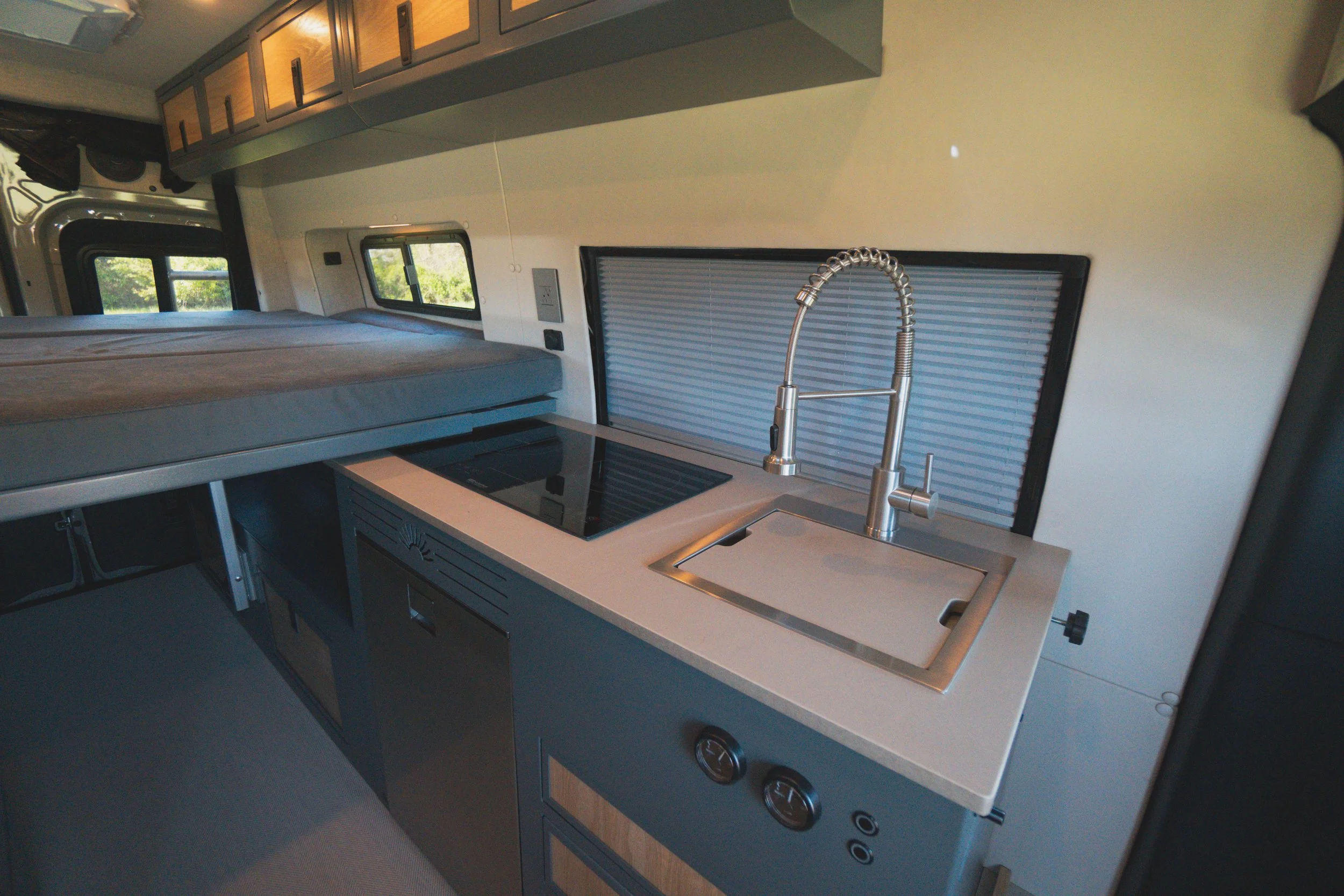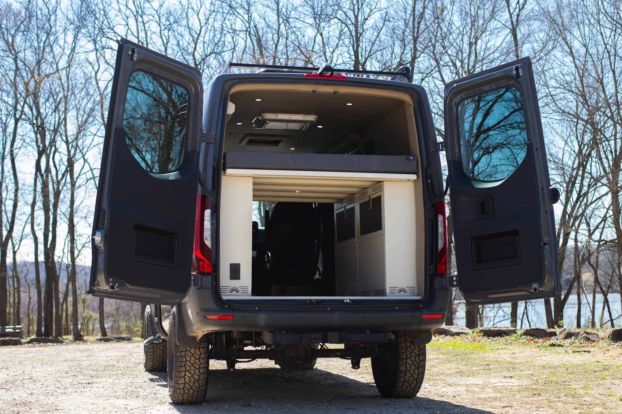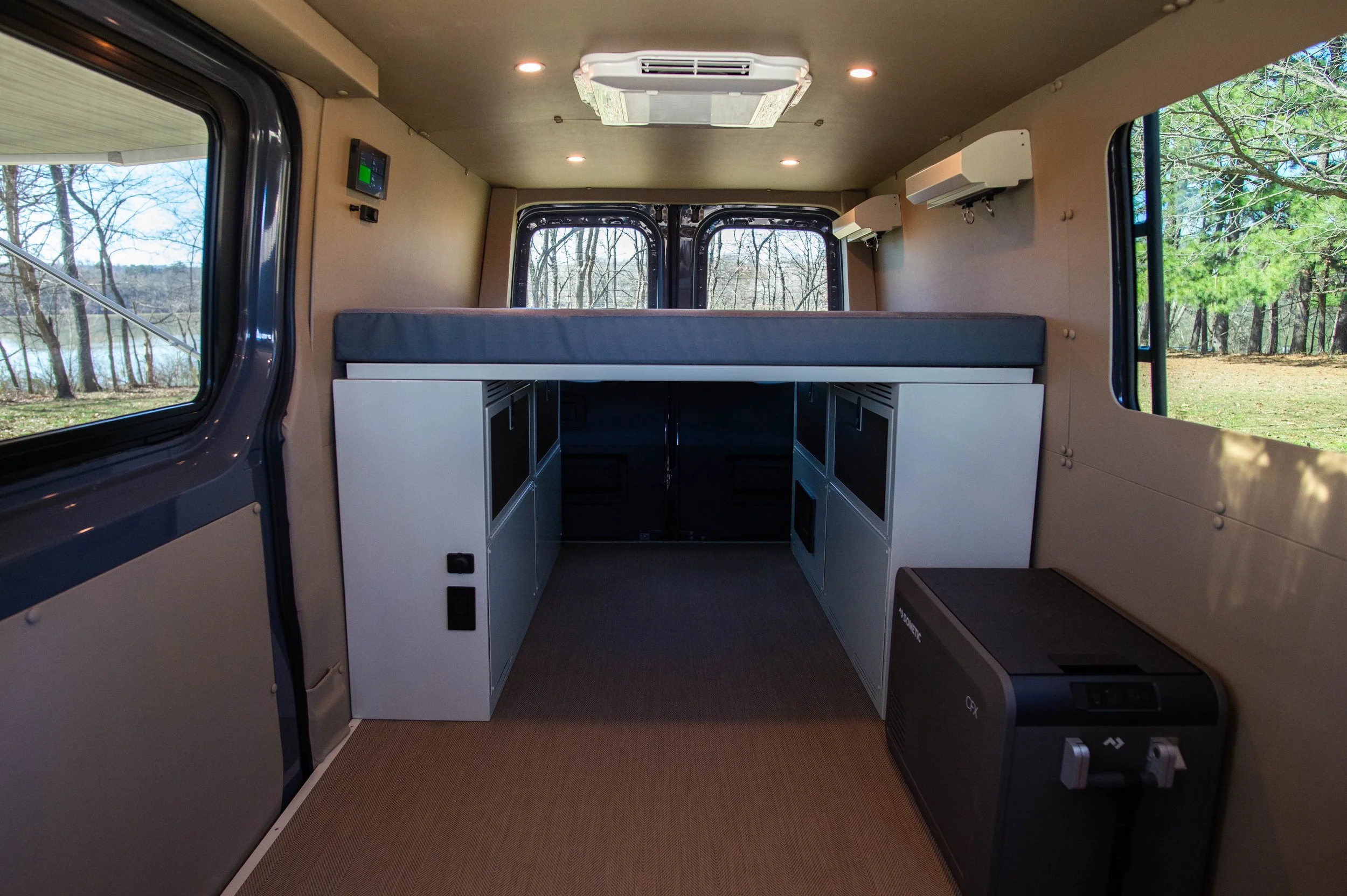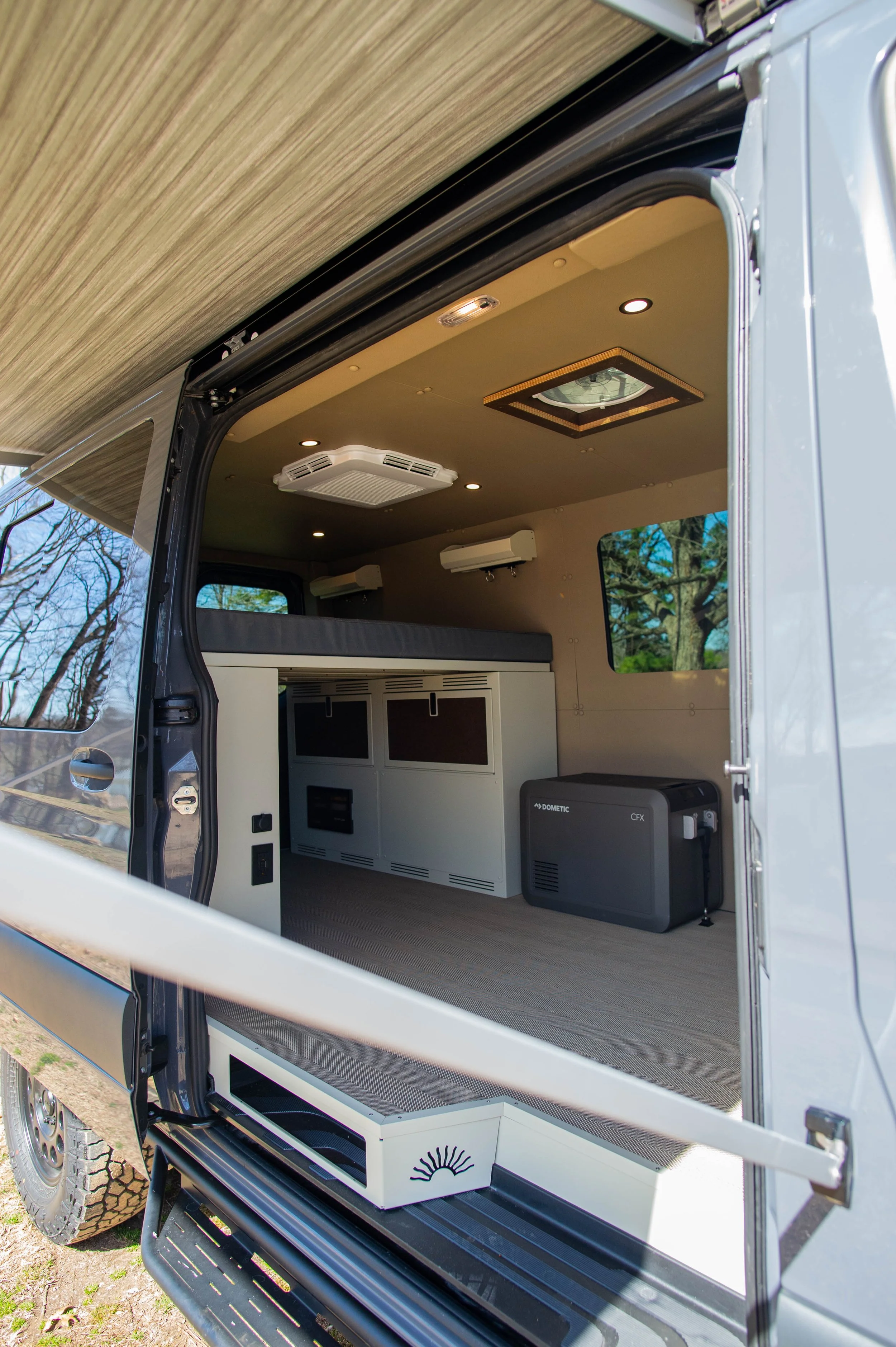 The Strike mission is ready when you are! IT’s designed to be a cost effective interior build while still giving you creature comforts that matter. It features two vent fans. One can be upgraded to an AC. The strike mission is equipped with an Espar heater, removable Open Road bed system, 12volt fridge, fully insulated walls and ceiling, 2 aluminum utility cabinets, and much more. You can easily upgrade to a galley cabinet and add fresh water. There is also plenty of space to add additional seating if needed.
