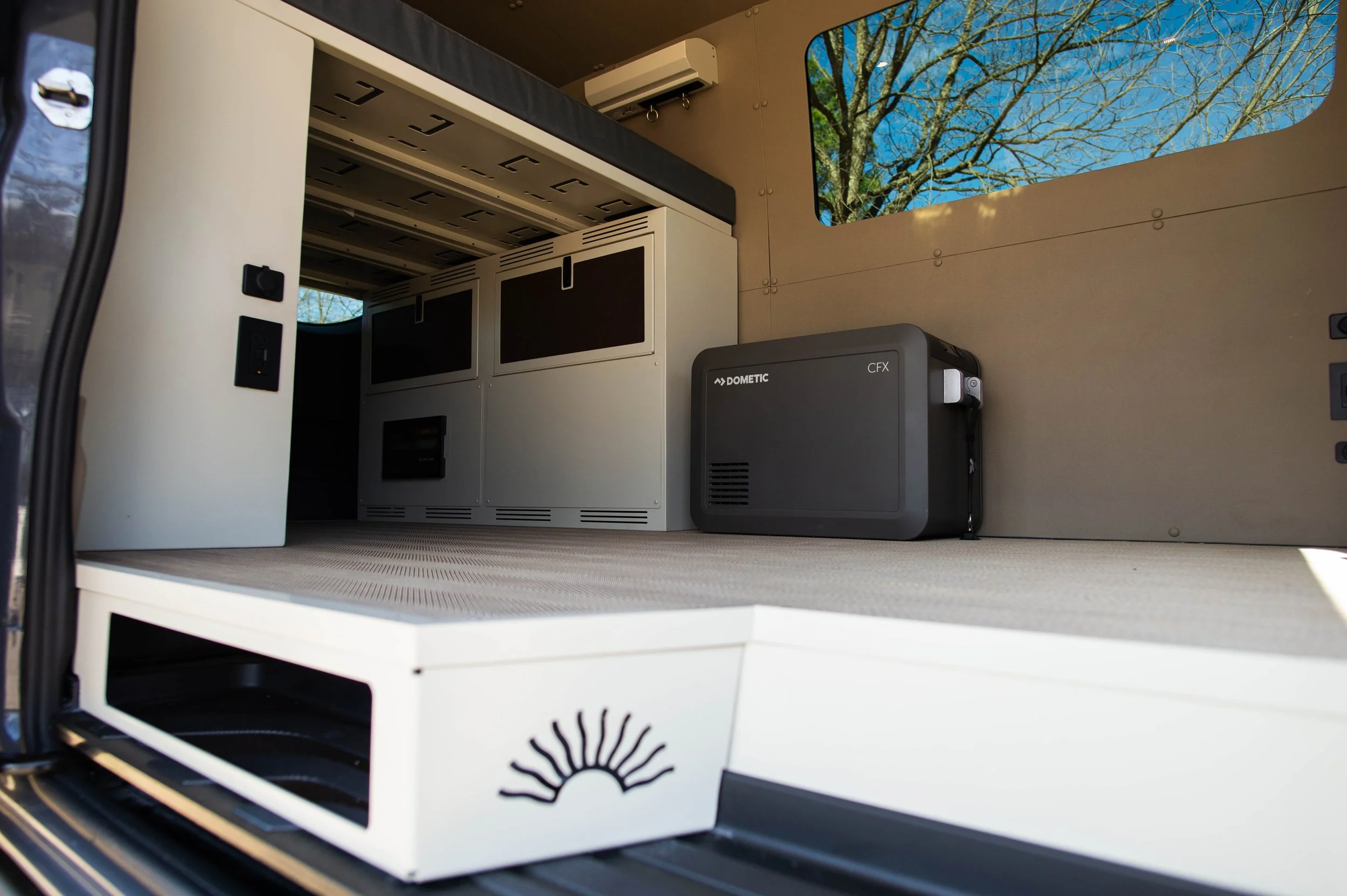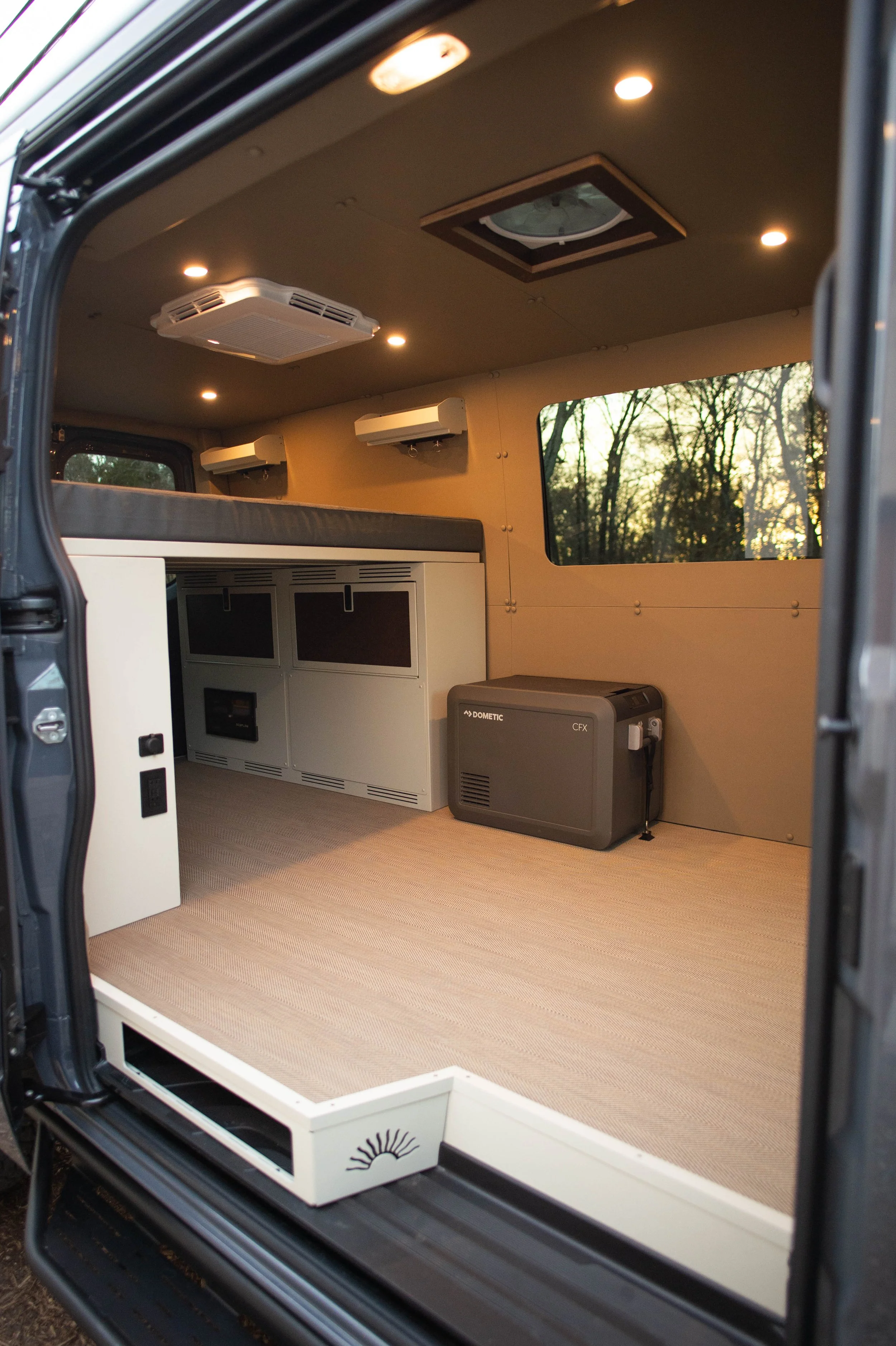 The Strike mission is our most simple floor plan to date. designed to be a fully modular interior. Easy to use as a cargo van or take out for a weekend rip! It features our removable bed system, a simple 12volt refrigerator, 2 vent fans, and a diesel heater.